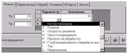 В поле «Параметр» вводится имя параметра режима, в поле «Значение» вводится числовое значение параметра. Для упрощения ввода имени параметра можно воспользоваться выпадающим списком: