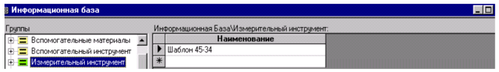 При открытии ИБ кнопкой […] производится автоматический вход в группу «Режущие инструменты». После выбора кнопки [Добавить в ТП], для передачи режущего инструмента в ТП, окно Информационной базы не закрывается, а в дереве классификации ИБ открывается группа «Измерительный инструмент», затем «Вспомогательный инструмент», «Вспомогательные материалы», «Приспособления» и «Дополнительные материалы». В этих или других группах ИБ можно указывать требуемые строки, выбирая кнопку [Добавить в ТП]. Такая автоматическая последовательность открытия групп ИБ включается, только если при открытии ИБ в списке оснащения перехода не было ни одной строки.
