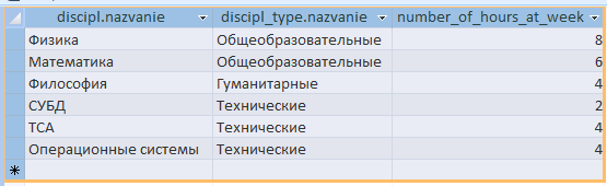 SELECT [discipl].[nazvanie], [discipl_type].[nazvanie], [plan].[number_of_hours_at_week]