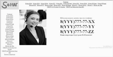 Особенности дизайна сайта. Дизайн сайта выполнен в спокойных распологоющих к нему (сайту) тонах не заружающих зрение пользователя. Для таких пунктов, как рекламный слоган, номера оператора и цена товара выбран резкий тонизирующий цвет, который призван привлечь основную часть внимания пользователя. Основная задача резкого цвета заставить пользователя купить именно здесь.