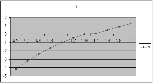для нахождения корней нелинейного уравнения мы изначально построим график функции на отрезке [0.2; 2] с шагом 0,2 , так как нам нужны положительные действительные (вещественные) числа, для которых вычисляется натуральный логарифм ( т.е. х>0, х