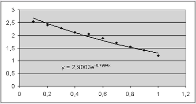 - в ячейку В6 вводим формулу = 2,9003*ЕХР(-0,7994*В1)