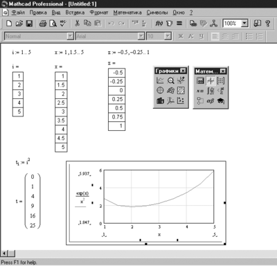 Например, выражение a:=1, 1.5, …10 описывает ранжированную переменную a со значениями от 1 до 10 с шагом 0,5.