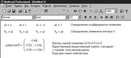 Для поиска корней полинома степени n существует специальная функция polyroots(V). Она возвращает вектор всех корней полинома степени n, коэффициенты которого находятся в векторе V, который имеет длину n+1. Заметим, что корни полинома могут быть как вещественными, так и комплексными числами. Не рекомендуется пользоваться этой функцией, если степень полинома выше пятой, поскольку в этом случае трудно получить малую погрешность вычисления корней.