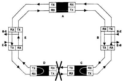 На рис. 8. приведена схема двунаправленного кольца с двумя волокнами, в которой показано, как сигналы двунаправленной связи (например, от В к Е или от Е к В) в условиях нормального функционирования пересекают одни и те же секции кольца, поэтому в случае повреждения поражаются оба направления.