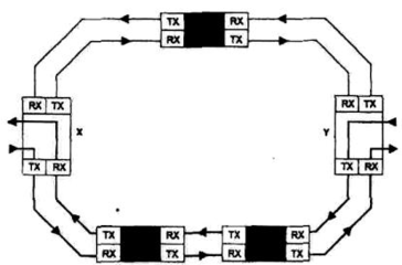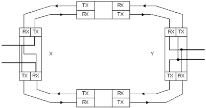 – двунаправленные, когда во время нормального осуществления связи между двумя узлами X и Y сигнал транспортного потока от X к Y протекает по кольцу в направлении, противоположном относительно сигнала Y к X (рис. 7).