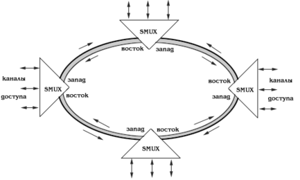 Топология "кольцо" (рис.1) широко используется для построения SDH сетей первых двух уровней SDH иерархии (155 и 622 Мбит/с). Основное преимущество этой топологии - лёгкость организации защиты типа 1+1, благодаря наличию в синхронных мультиплексорах SMUX двух пар оптических каналов приёма/передачи: восток - запад, дающих возможность формирования двойного кольца со встречными потоками.