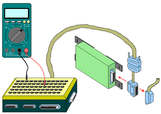 Конектор (рис.2) являє собою комутаційне поле, призначене для підключення затискачів універсальних вимірювальних приладів (мультиметра, осцилографа). Під’єднується до електричних кіл рознімання ЕБК, не порушуючи з’єднання із зовнішніми елементами системи. Щоб забезпечити універсальність конектора, щодо його використання (змогу під’єднуватися до ЕБК з різними типами рознімань), застосовуються перехідні кабелі адаптери підключення. Використання конектора дозволяє виконувати вимірювання вхідних та вихідних сигналів, а також напруг живлення ЕБК у робочому стані системи на різних режимах її функціонування.