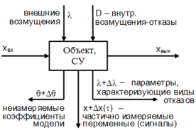 Необходимость в разработке научно обоснованных методов технической диагностики и технических средств для реализации диагностических систем и комплексов подтверждают результаты исследований, по которым установлено, что специалист 25% времени тратит на определенные части изделия, где произошла неисправность, 62% – на определение неисправной детали и только 13% времени – на восстановление отказавшей детали. Техническое диагностирование использует технические математические модели. Отличие диагностических моделей от обычных математических моделей, которые отражают номинальный режим функционирования объекта или системы управления состоит в том, что диагностическая модель описывает существенные свойства аварийных режимов, вызванных различными отказами. Объект или система при разработке диагностической модели рассматриваются по следующей схеме (рис. 3.):