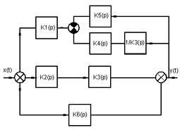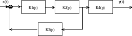 Для удобства вычисления передаточной функции системы по управляющему сигналу упростим структурную схему системы 1 и изобразим её на рисунке 2. Упрощение произведём следующим образом: выходы звеньев 4 и 5 соединим и заведём на обратную (отрицательную) связь в одну точку. Также перенесём вход звена 4 с точки соединения звеньев 2 и 3 на выход звена 3 при этом переносе добавим последовательно перед входом звена 4 звено с передаточной функцией обратной К3(р).