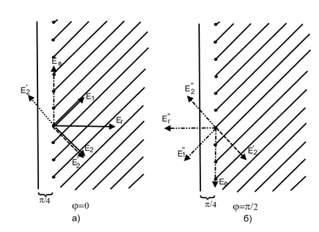 Горизонтально поляризованная волна Ег, попадая на поляризационную решетку, раскладывается на параллельную Е1 и перпендикулярную Е2 составляющую (Рис. 2,а).
