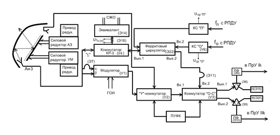 - передачу электромагнитной энергии от облучателя на вход I, II приемника (бл. Р-7М1) в режиме ОБЗОР;