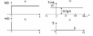 ; передатна функція: W(s) = к; амплітудно-частотна характеристика (АЧХ)-W()=k; фазо-частотна характеристика (ФЧХ)-()=0; логарифмічна амплітудно-частотна характеристика – L()= 20 lg к; комплексний коефіцієнт передачі - W(j)=к (рис.5).