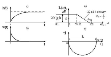 Рисунок 6 – Характеристики інерційної ланки: а) перехідна, б) імпульсна перехідна, в) логарифмічна амплітудно-частотна, г) годограф комплексного коефіцієнта передачі