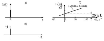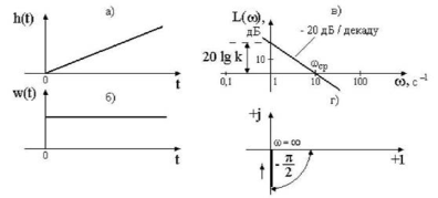 Рисунок 7 – Характеристики інтегруючої ланки: а) перехідна, б) імпульсна перехідна, в) логарифмічна амплітудно-частотна, г) годограф комплексного коефіцієнта передачі