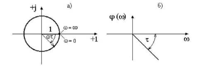 Рисунок 9 – Характеристики ланки чистого запізнювання: а) годограф комплексного коефіцієнта передачі; б) фазо-частотна характеристика