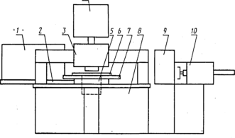 Технологическая схема и состав ГПМ представлен на рис. 3. Процесс функционирования ГПМ следующий. Печатная плата из накопителя 8 подается устройством загрузки-выгрузки 9 к координатному столу сборочного автомата 6 и фиксируется на нем с помощью фиксирующего устройства 5. Координатный стол перед этим выводится в нулевое (крайнее справа и назад) положение. После фиксации ПП координатный стол подается к укладочной головке 2, которая в соответствии с заданной программой перемещения ПП производит вырезку ИЭТЭ из ленты, формовку выводов, установку ИЭТ по направляющим выводам в монтажные отверстия ПП и крепление ИЭТ подгибкой выводов под ПП навстречу друг другу или по радиусу. Излишки выводов обрезаются перед подгибкой.