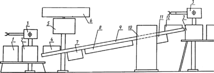 Технологическая схема и состав ГПМ представлен на рис. 5. Загрузка и выгрузка печатной платы описана выше. Укладочная головка 4 совмещает операции установки и пайки ИС, которые подаются по транспортному устройству 9 из накопителя ИС ленточного '2 или кассетного 1 типов. В ленточном накопителе ИС уложены в той последовательности, в которой будут устанавливаться на ПП. Кассетный накопитель вращается по команде управляющей системы и выдает в транспортную систему ИС нужного типа из соответствующей кассеты. ИС, установленная на ПП, удерживается на ней в процессе выполнения пайки (до ее затвердевания). Пайке подвергаются все выводы ИС одновременно; способ - электроконтактный. Подача припоя и флюса производятся непосредственно в зону пайки. ГПМ устанавливает и паяет на ПП ИС только одного типоразмера в корпусах 401 (или 402, или 405).