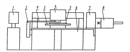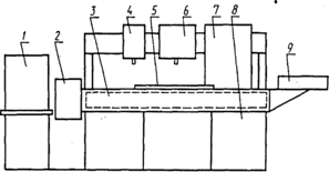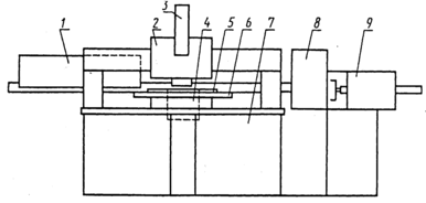 Рис. 5 - ГПМ установки и пайки ИС с планарными выводами на ПП: 1 — накопитель ИС (кассетный) ; 2 — накопитель ИС (ленточный) ; 3 — координатный стол; 4 — автоматическая головка установки и пайки ИС; 5 — устройство фиксации ПП; 6 — устройство управления; 7 — накопитель ПП; 8 — автоматическое устройство загрузки и выгрузки ПП; 9 — устройство подачи ИС