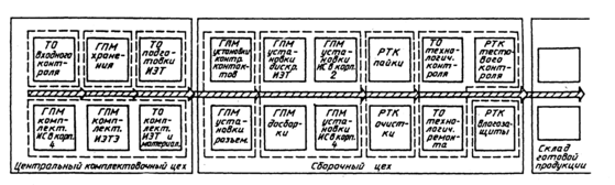 В состав ГПМ может включаться также оборудование для технологического или приемо-сдаточного контроля электрических параметров ЭМ-1, но чаще всего оно выделяется в самостоятельную подсистему. Состав ГПМ для конкретных производственных ситуаций определяется составом элементной базы ЭМ-1, подлежащих изготовлению в ГПС, масштабом выпуска, принятым вариантом технологического процесса.