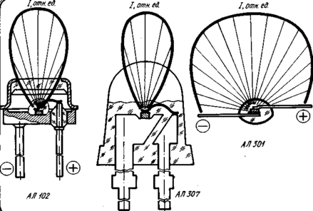 На рис.2.2. показаны конструкции некоторых наиболее распространенных типов светодиодов и их диаграммы направленности. Как видно, существуют три типа светодиодов: в металлостеклянном (АЛ 102), пластмассовом (АЛ 307) корпусе и бескорпусные (АЛ 301). Первый тип светодиодов характеризуется высокой надежностью и стабильностью параметров, а второй – технологичностью и низкой стоимостью, большой стойкостью к действию ударных и вибрационных нагрузок, возможностью управления диаграммой направленности излучения в направлении как ее расширения, так и сужения.
