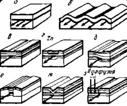 Гетероструктура с канавкой, которую формируют перед выращиванием эпитаксиальных слоев (рис.3.1, г), обеспечивает одномодовую генерацию. Иногда толщину слоев гетероструктуры делают переменной, а сами слои располагают наклонно, как, например, в ППЛ «террасного» типа (рис.3.1, д). Минимальный по ширине пучок излучения характерен для ППЛ с «зарощенной» мезаполосковой структурой (рис.3.1, е), с V-образной структурой (рис.3.1, ж) и с поперечным p-n-переходом (рис.3.1, з).