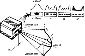 На рис.3.1. приведены наиболее распространенные конструкции инжекционных ППЛ. Импульсные лазеры имеют обычно широкие контакты, плоский или гофрированный активный слой (рис.3.1, а, б). Для большинства непрерывных лазеров, работающих при комнатной температуре, характерна полосковая геометрия с резонатором, образованным зеркальными сколами торцевых поверхностей кристалла. Полосковый контакт (рис.3.1, в) обеспечивает уменьшение ширины активного слоя W до величины 3-25 мкм и резкое снижение порогового тока. На практике применяют различные методы формирования полосковых структур – с использованием окисной изоляции (рис.3.1, в), мезаструктур, создание высокоомных областей, окружающих активный слой с боковых сторон, и др. При W < 10 мкм удается устранить возникновение в пределах активного слоя нескольких областей с высокой интенсивностью излучения (так называемых световых "шнуров"), которые можно трактовать как поперечные моды. На рис.3.2. показана структура таких мод при различной ширине активного слоя W. Видно, что при W = 10 мкм излучается одна мода, характеризуемая гауссовским распределением интенсивности.