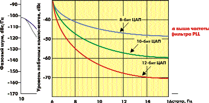 В цьому випадку вони здатні потрапити в робочу область частот в результаті дзеркального відображення спектру щодо частот n·FCLK. На рисунку 5 приведені залежності рівня побічних компонентів від розрядності коду фази для ЦАП різної розрядності.