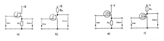 Сопротивление полевого транзистора в открытом состоянии может составлять 7-30 Ом. Сопротивление полевого транзистора по цепи управления может составлять 108-109 Ом. (схемы "а" и "б") и 1012-1014 Ом (схемы "в" и "г").