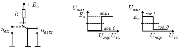 Электронные ключи основаны на работе биполярных транзисторов. Когда на базе транзистора «0» относительно эмиттера, транзистор «закрыт», ток через него не идёт, на коллекторе всё напряжение питания (сигнал высокого уровня — «1»). Когда на базе транзистора «1», он «открыт», возникает ток коллектор — эмиттер и падение напряжения на сопротивлении коллектора, напряжение на коллекторе, а с ним и напряжение на выходе, уменьшается до низкого уровня «0».