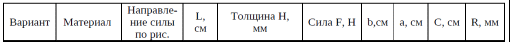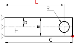 К свободному краю консольно-закрепленной плоской прямоугольной пластины с отверстием приложена нагрузка F в точке, отмеченной красным. Материал и размеры даны в таблице. Провести моделирование пластины под нагрузкой, определить деформацию пластины и напряжение в материале. Вид на рисунке сверху.