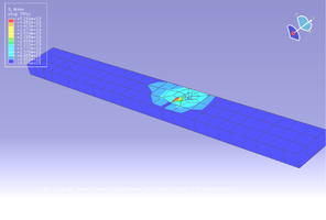 Зададим свойства материалу: плотность серебра 104920 кг/м3, модуль Юнга 71ГПа, коэффициент Пуассона 0,3. Создав сечение балки (section), присвоим материал нашей модели. В модуле Step задаются шаги анализа — у нас статическая задача (Static, General). В модуле Load вводится защемление и ограничение балки. При этом 770 Н направлены вниз. Решение показано на рис. 21.