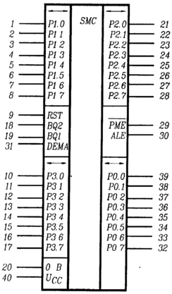 | 10-17 | P3.0-P3.7 | 8-разрядный двунаправленный порт P3 с дополнительными функциями: | вход/ выход |