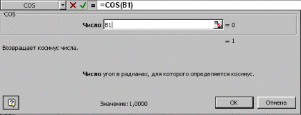 Здесь тоже есть подсказки. Кроме смысла функции нам поясняют и смысл аргументов. В данном случае, как видите, написав в строке Число следует ввести угол в радианах - цифрой или именем ячейки.