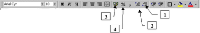 С помощью одной из них (1) вы уменьшаете разрядность показываемого числа на единицу, а с помощью другой (2) увеличиваете. Есть кнопка (3), которая задает денежный формат представления числа с наименованием "р.", заодно "округляя" число до двух знаков после запятой (мельче копейки денежных единиц, вроде бы, не существует). Формат денег задается не в Ехсеl, а в Панели управления Windows (Control Panel) - Стандарты (Язык и стандарты, International). А кнопка (4) задает процентный формат представления числа, сразу подставляя наименование "%" и попутно увеличивая число в сто раз: если в ячейке было 1,25, то станет 125%. Что ж, своя логика в этом есть. Вылезающее за границу ячейки число в процентном и денежном формате вообще не будет показано. Вместо него вам будет предъявлен такой вот частокол: ////////////. Уменьшайте размерность, округляйте число или раздвигайте ячейку.