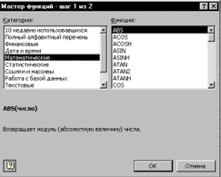 На рис. 17 показано первое диалоговое окно мастера. Слева выбираем категорию функции, справа - саму функцию. Нам нужна категория Математические, имя функции - COS. Тут же будет дана первая подсказка: внизу окна, над кнопками, появится сообщение о том, что команда COS "Возвращает косинус числа" (слово "возвращает" на птичьем языке программистов означает "рассчитывает, вычисляет"). С помощью этой подсказки, возможно, удастся разобраться в громоздких и не всегда понятных аббревиатурах команд.