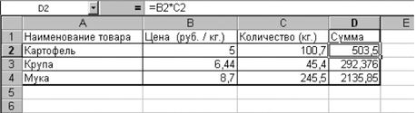 Обратите внимание, что в строке формул (в поле формулы) для ячейки D2 отображается уже не число, которое вы видите на экране в ячейке (503,5), а формула, запись которой начинается со знака " = ": = В2*С2. Эту формулу можно прочитать следующим образом: "Значение в ячейке D2 равно значению, хранящемуся в ячейке В2, умноженному на значение в ячейке С2".