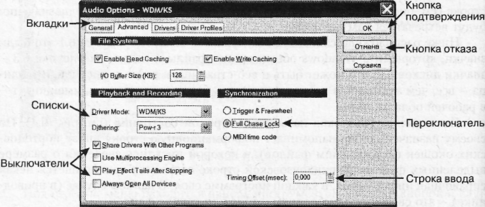 Чтобы не увеличивать размеры наиболее сложных окон, разработчики довольно часто делают их многостраничными. Посмотрите на строку закладочек вверху нашего рисунка. Щелкая по любой из них, мы будем переходить на другие страницы этого окна (или, как иногда говорят, вкладки), каждый раз получая еще один набор настроек. Закладка как-то обозначает назначение своей страницы, например: общие настройки (General), дополнительные настройки (Advanced) и т. д.
