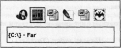 Между запущенными программами можно переходить и без помощи мышки, с одной только клавой. Для перехода в другую программу предназначена клавиатурная комбинация Alt-Tab: нажимаете клавишу Alt и, не отпуская ее - клавишу Tab. Появится табличка со значками всех ранее запущенных вами программ, как на рис. 26 (те же самые Opera, FAR, Word (два разных документа), Photoshop и The Bat!). Если, по-прежнему не отпуская клавишу Alt, нажимать несколько раз Tab, то рамочка вокруг значка будет переходить с одной запущен ной программы на другую. На каком значке вы отпустите клавишу Alt, в ту программу и перекинет вас Windows.