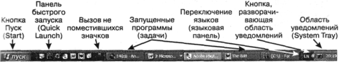 Панель задач делится на четыре блока. Самый правый, в котором сидят и виндоузовские часы, называется областью уведомлений (System Tray, в буквальном переводе - системный лоток), левее располагается собственно панель задач (Task Bar), на которой мы видим кнопки запущенных программ, далее -панель быстрого запуска (Quick Launch) и самый левый блок - кнопка Пуск (Start), раскрывающая главное меню Windows.
