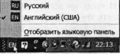 Например, щелкнув по переключателю клавиатуры один раз (левой кнопкой), вы сможетепоменять раскладку: после щелчка рядышком спереключателем всплывает меню, как показано на рисунке 28. В нем две строки – Английский и Русский.