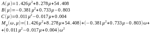 Строки матрицы выражают зависимость слагаемых (А(μ), В(μ) и С(μ)) функции Mg(ω,μ) от μ, соответственно 1-ая строка А(μ), 2-ая строка В(μ), 3-я строка С(μ). А(μ), В(μ) и С(μ) имеют вид: