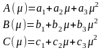Коэффициенты при μ вычисляются методом наименьших квадратов из матрицы ABC по строкам. Так для А(μ) по первой строке матрицы ABC из системы