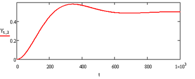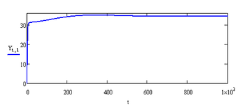 Решая систему численно, получаем табличные значения ω(t) и μ(t), по которым строим графики ω(t) (рисунок 2) и μ(t) (рисунок 3). По графикам хорошо видно, что ω(t) и μ(t) стремятся к равновесным значениям ω0=31.948 и μ0=0.5, ω(t)→ 31.948, μ(t) →0.5, что соответствует вычислениям.