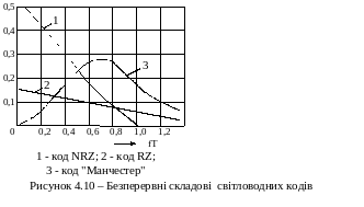 Безперервна частина спектра залежить не тільки від алгоритму побудови коду але й від форми поодинокого посилання. На рис. 4 наведені безперервні складові спектрів лінійних кодів у нормованому вигляді [13], де W(f) – спектральна щільність потужності, Т – тактовий інтервал, U – амплітуда імпульсу. Як випливає з рис. 4, найменшу ширину спектра має код NRZ. Коди NRZ та RZ мають максимуми СЩП на низьких частотах.
