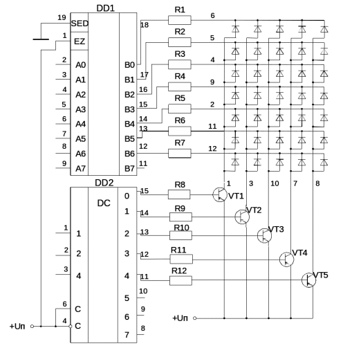 Произвести выбор типа индикатора в соответствии с режимом стробирования. ЭО должен гореть при совпадении низкого напряжения (логический «0») на строке и столбце.