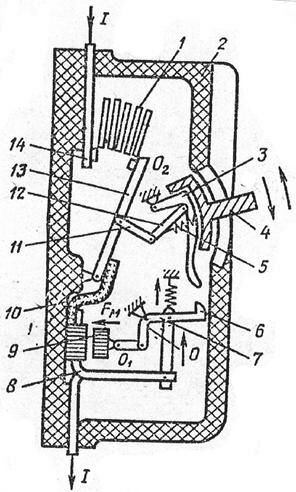 Виникаюча при розмиканні контактів автомата електрична дуга гаситься в дугогасильній решітці 1. Підвищення тиску усередині замкненого об’єму, утвореного ізоляційною основою і кришкою 2, сприяє гасінню дуги. Електромагнітний розчеплювач максимального струму спрацьовує практично миттєво при досягненні струму відсікання (відсікання відбувається миттєво при десятикратному струмі й більше), а час спрацьовування теплового розчеплювача при перевантаженнях, менших струмах відсікання, визначається захисними характеристиками. Серія вимикачів складається із чотирьох величин (1, 2, 3, 4) на номінальні струми відповідно 160, 250, 400 і 630 А.