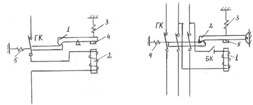 Електромагнітний розчеплювач забезпечує максимальний ( по струму КЗ) і мінімальний (по напрузі) захист. На рис.2 показана схема роботи максимального розчеплювача. При проходженні по ланцюгу котушки 2 електромагнітного розчеплювача номінального струму, пружина 3 утримує якір електромагніту 4 розімкнутим, а засувка 1 - головні контакти ГК - замкненими. При підвищенні струму в ланцюзі котушки 2 сила тяги електромагніту зростає до величини, що перевершує силу утримуючої пружини 3. Якір 4 замикає магнітний ланцюг електромагніту, звільняючи засувку 1 і розмикаючи ГК.