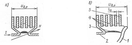 Дугогасильна система. В автоматах застосовуються напівзакрите й відкрите виконання дугогасильних пристроїв. В універсальних автоматах масового застосування широко використовується деіонна дугогасильна решітка зі сталевих пластин (рис. 1). У решітці на рис. 1.а) дуга виводиться на пластини й ділиться між ними за допомогою магнітного поля напруженістю Н, створюваного спеціальною системою, на короткі дуги. На рис.1.6) дуга втягується в решітку за рахунок електродинамічних зусиль, що виникають у контурі 1, 3, 2, і за рахунок зусиль, що діють на дугу, завдяки наявності феромагнітних пластин 5.