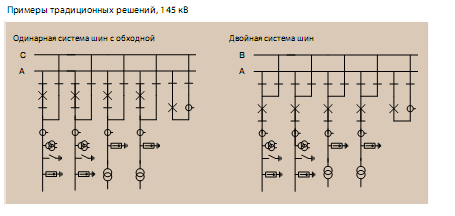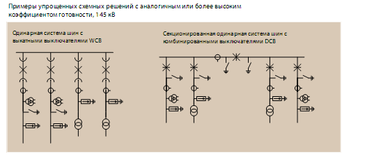 Підвищена готовність вимикачів, у тому числі безпосередньо підключених до шин, знижує потреби у частому відключенні шин. Це дозволяє перейти до застосування спрощених схемних рішень. Взявши за основу сучасні елегазові вимикачі, АББ пропонують два альтернативні рішення, які дозволяють спростити схему підстанції й заощадити зайняту площу.